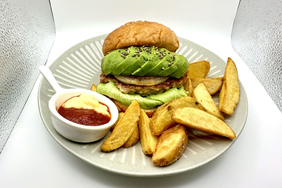 鶏肉100%のジューシーなパティであっさりとした口当たりながら、しっかりとした食べごたえがあり、野菜や自家製ソースとのバランスにもこだわって仕上げています。