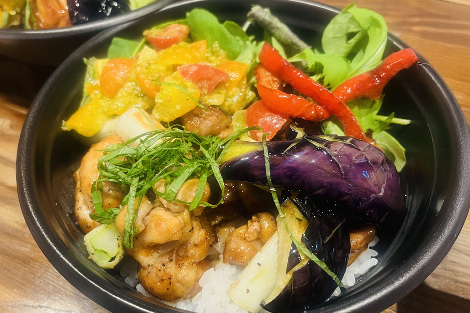 武蔵野市のナスとトマトを使い、彩り豊かな旬野菜をたっぷり合わせた焼き鳥丼。